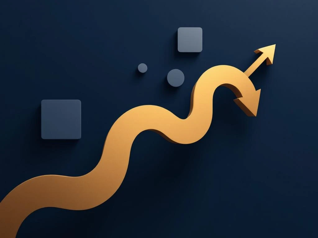 Gouden cirkels en pijlen vormen een geometrisch pad van donkerblauw naar goud, dat het verkoopuitbetalingsproces weergeeft