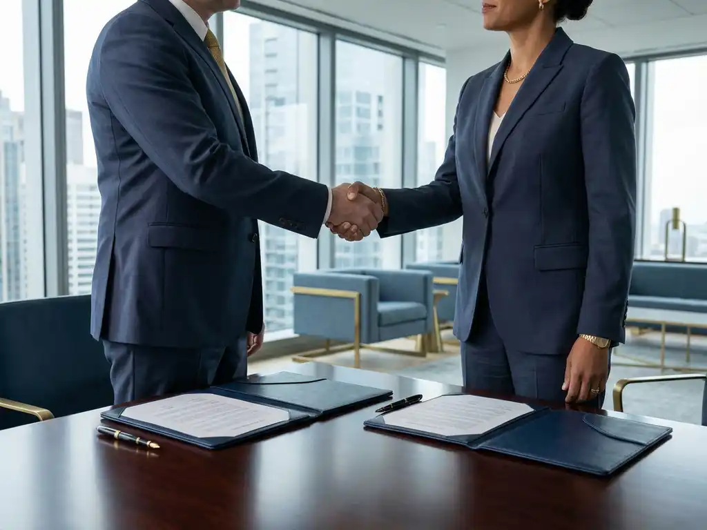 Twee zakelijke professionals schudden handen boven mahonie vergadertafel met getekende acquisitiedocumenten en vulpen
