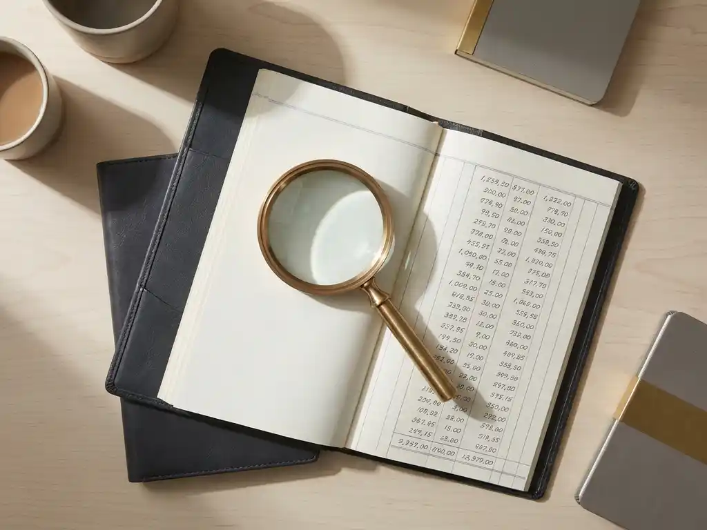 Messing vergrootglas op open financieel grootboek met nette cijferkolommen, minimalistische kantooromgeving